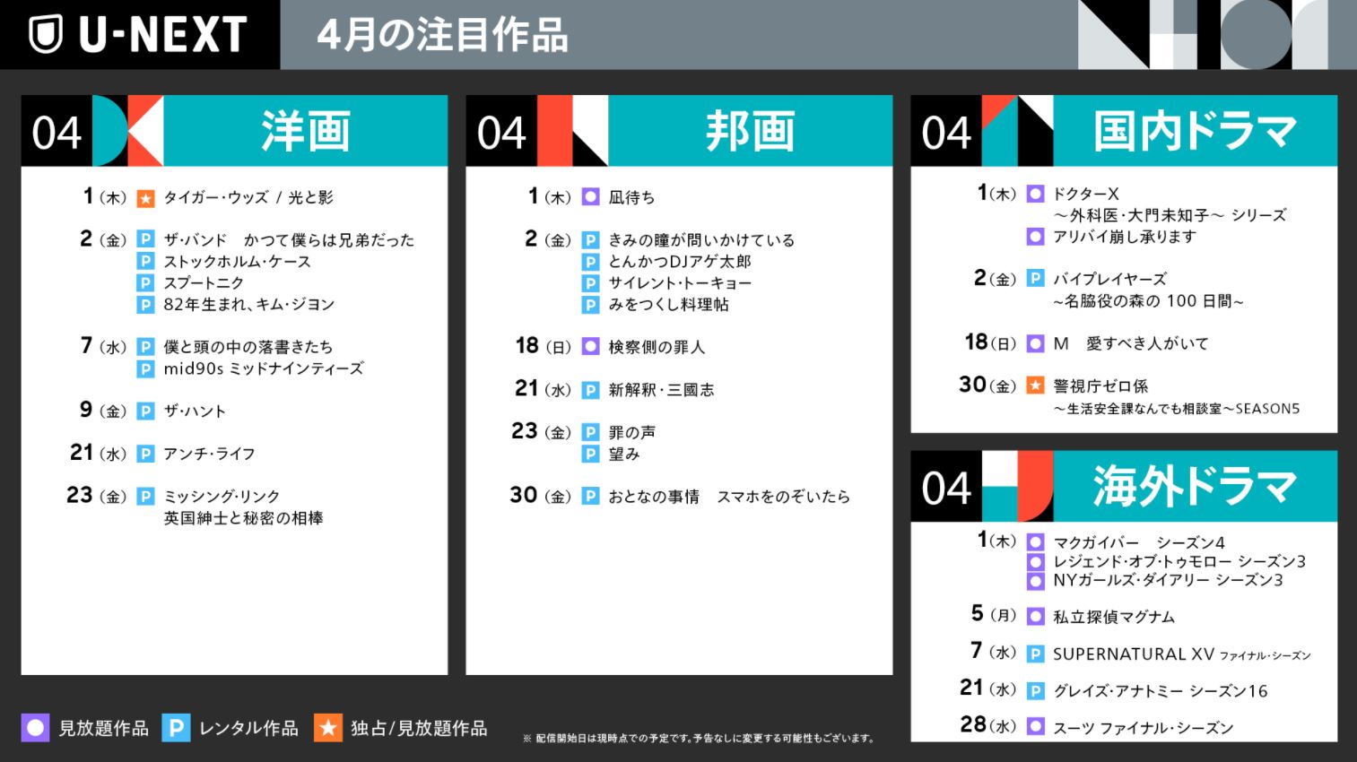 4月のHuluプレミア配信予定